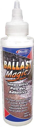 Ballast Magic de Deluxe Materials est une nouvelle façon de ballaster les voies à toutes les échelles. L'adhésif lui-même est une fine poudre sèche qui est très facile à mélanger avec le ballast. Une fois le mélange d'adhésif et de ballast posé sur la voie, il faut le vaporiser d'eau à l'aide du flacon pulvérisateur Ballast. L'utilisation de Ballast Magic est une nouvelle façon agréable de coller le ballast. Le collage est réversible avec de l'eau chaude.